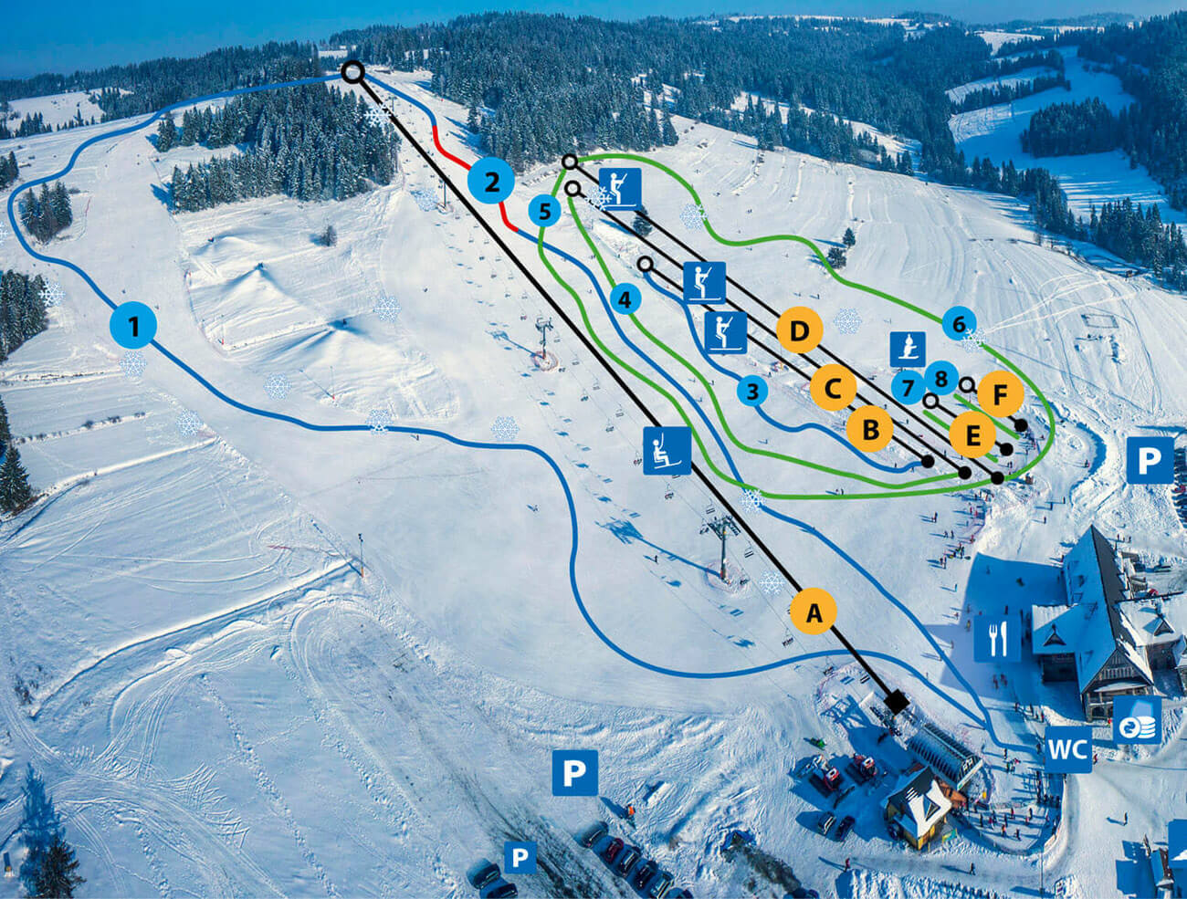 PistaPiste verdi8%Piste blu66%Piste rosse26%Totale piste8Piste più lunghe1 kmArea sciabile2.7 kmSci notturno2.2 kmInnevamento programmato2.2 km